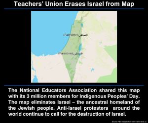 When confronted, NEA leadership issued a statement claiming it “regretted the error” – reaffirming a generic commitment to combat “all forms of discrimination.” But the map itself was never corrected. The union also praised the partner organization that created it. What should have been a clear-cut apology became a case study in institutional avoidance – proof of how normalized anti-Israel bias has become in some professional educational spaces.