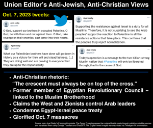 This incident is not isolated. In New Jersey, lawmakers demanded action after a magazine editor of NJ’s NEA chapter, Ayat Oraby, posted vile anti-Christian, anti-Jewish and pro-Hamas messages on social media to her more than 1 million followers: