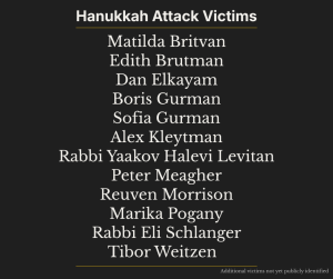 The victims spanned generations and backgrounds, including a 10-year-old girl, respected rabbis, a Holocaust survivor and other community members whose lives were rooted in faith, family and public service. The event was organized by Chabad – an international Jewish organization with more than 6,000 emissaries in more than 100 countries – known for its outreach to both religious and non-religious Jews.