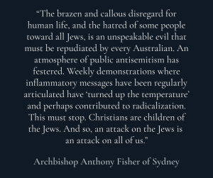 Only days before the terror attack, leaders from the world’s seven largest diaspora Jewish communities concluded a conference in Australia. Representatives from Argentina, Australia, Canada, France, Germany, the UK and the U.S. met to “show our solidarity with the Australian Jewish community and reiterate our call on our governments to ensure the security of the Jewish community.”
