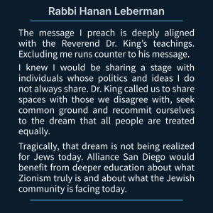 Organizations that claim the language of civil rights are increasingly using MLK Day to exclude Jews from civic participation. Alliance San Diego disinvited Rabbi Hanan Leberman from giving a benediction blessing at this year’s All Peoples Celebration – because of his “Zionist views.” The event’s organizers present their mission as an “inclusive democracy where everyone can participate fully with dignity.”