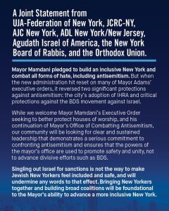 In his first days in office, Mamdani reversed key policies to protect Jewish communities from antisemitism. He revoked executive orders that adopted the International Holocaust Remembrance Alliance working definition of antisemitism, restricted city engagement with the Boycott, Divestment and Sanctions (BDS) Movement against Israel and provided guidance to the NYPD on handling protests near houses of worship. The new mayor’s actions struck down clear standards and safeguards at a moment of rising anti-Jewish hostility.