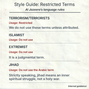 The Washington Free Beacon recently published excerpts of Al Jazeera’s style guide that bans reporters from calling Islamic State (ISIS) and Hamas “terrorist” organizations and prevents journalists from using other terms. The media organization – which operates an American news channel and maintains a massive social media presence – was founded and funded by the Qatari government.