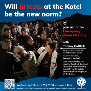 Last week, our friend and MERCAZ representative on WZO’s Executive Board, Tammy Gottlieb, was arrested while participating in Women of the Wall’s Rosh Hodesh Adar tefillot at the Kotel.